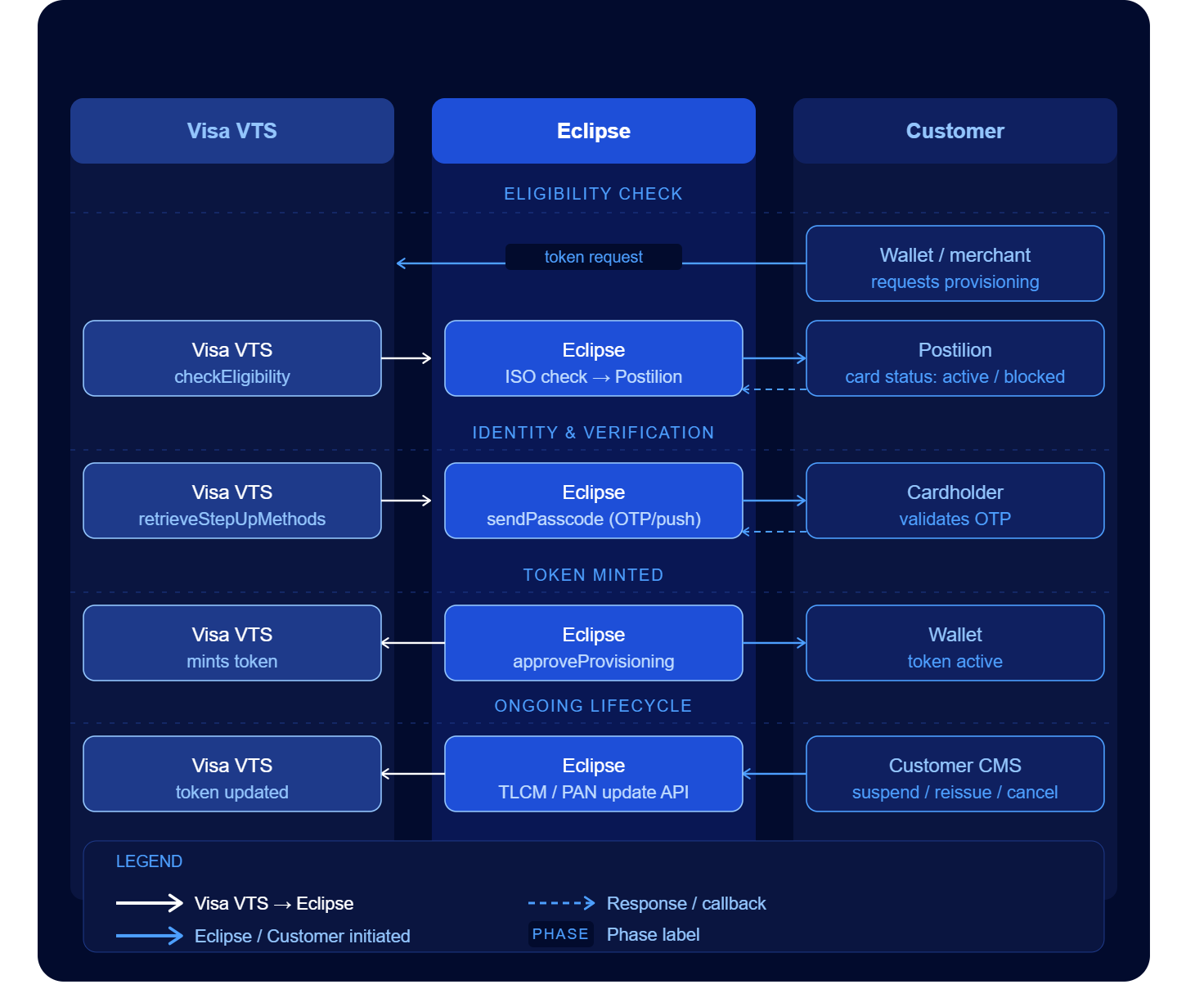 POST /vtis/v1/sendPasscode— OTP sent via customer's comms channel - Cardholder enters OTP in wallet; Eclipse validates and approves