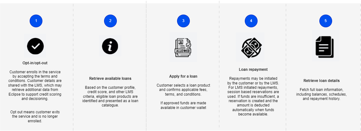 Eclipse offers a standard integration model for Loan Management System (LMS) providers, supports aggregation across multiple LMSs, and exposes all functionality through simple, consistent APIs. This allows tenants to offer a wide range of loan services through a single integration, covering the full loan lifecycle from origination to repayment.